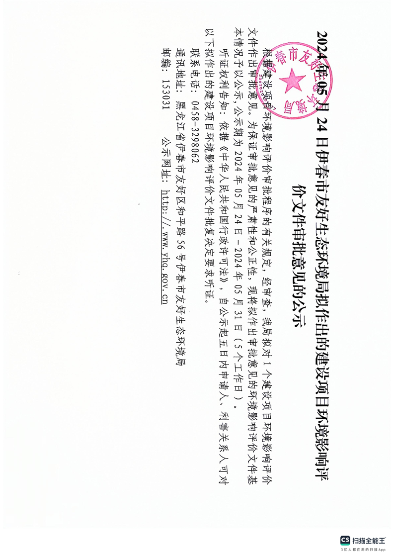 2024年05月24日伊春市友好生态环境局拟作出的建设项目环境影响评价文件审批意见的公示