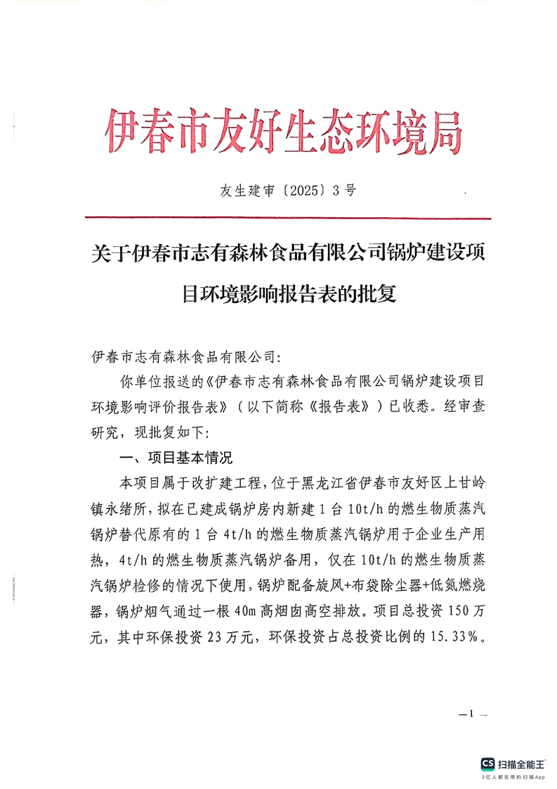友生建审〔2025〕3号关于伊春志有森林食品有限公司锅炉建设项目环境影响报告表的批复